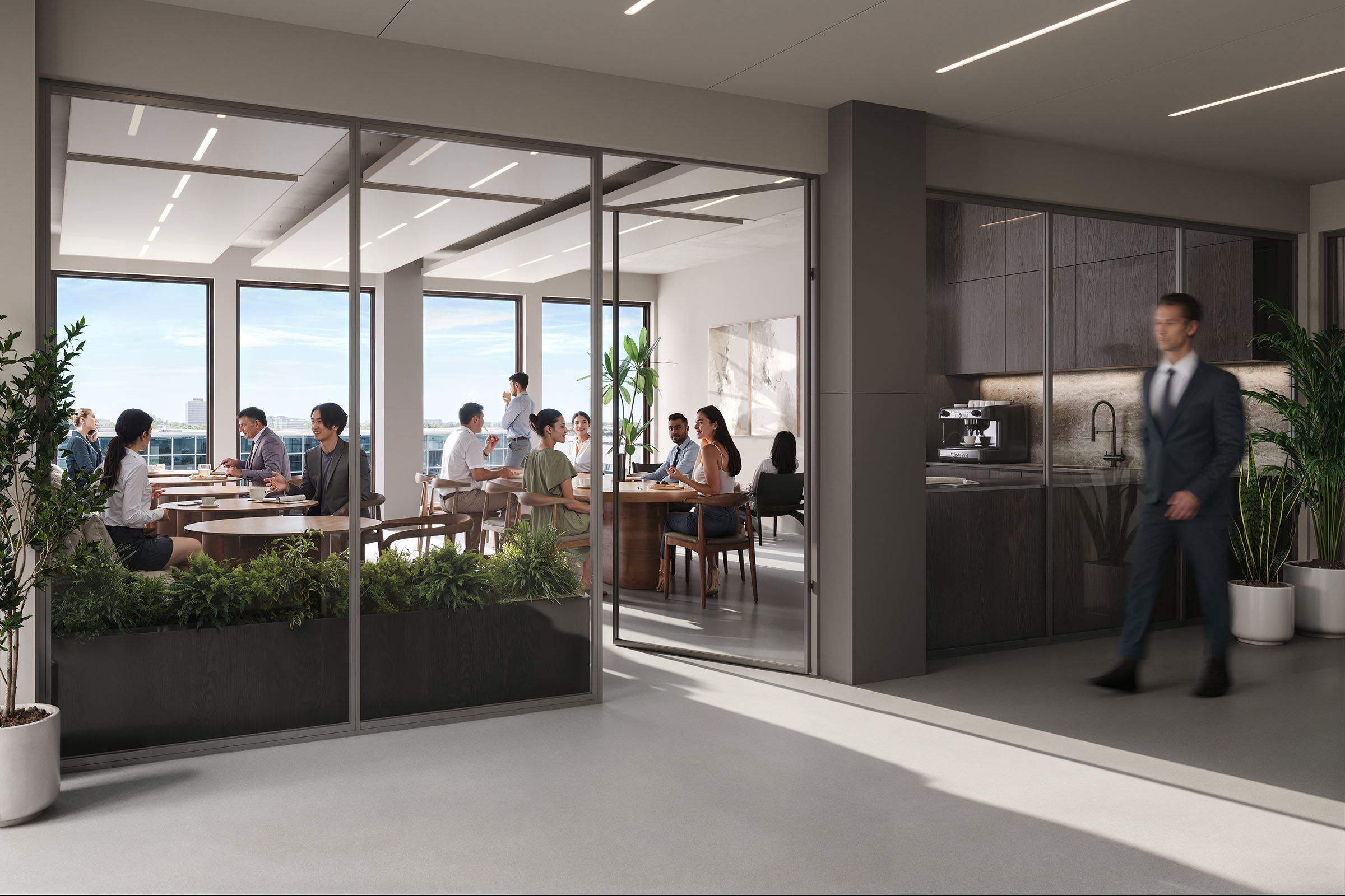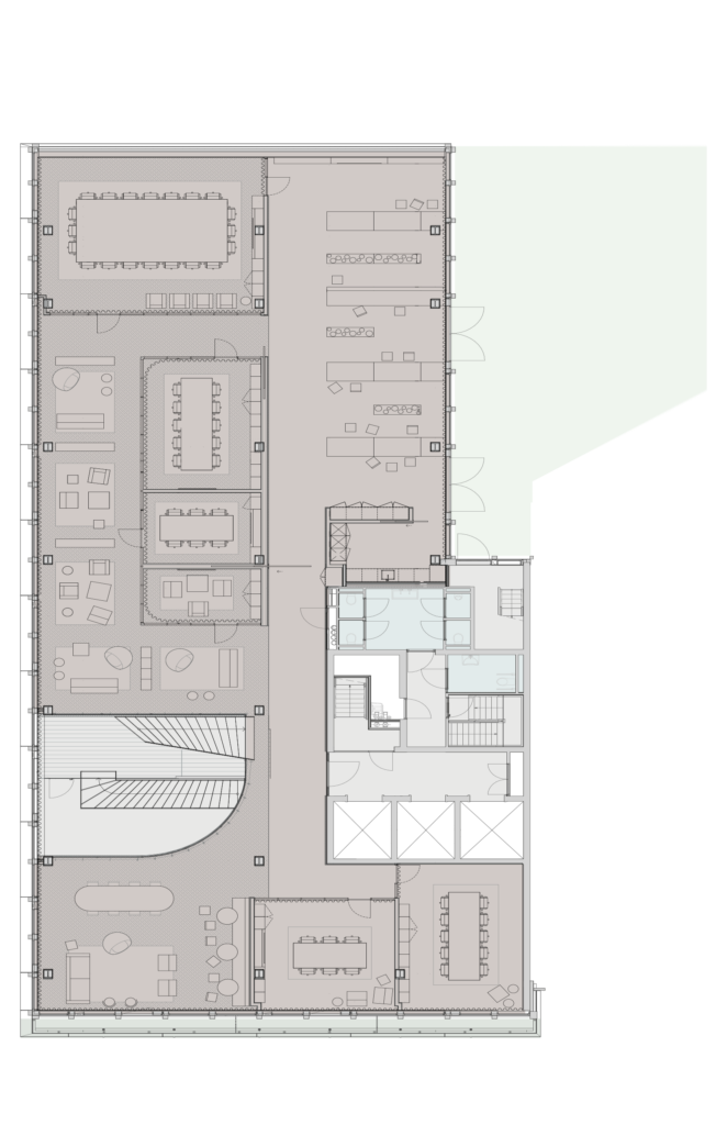 Shared meeting and coworking facilities on the first floor means you can use your own office space more efficiently. Each floor features a private balcony, an uncommon luxury that adds real value to the workday.